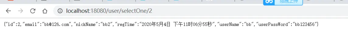在浏览器中输入连接http://localhost:18080/user/selectOne/2