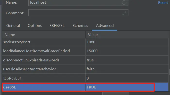 点击Advanced标签页,找到serverTimeZone,将其值设置为UTC,找到useSSL将其值设置为True