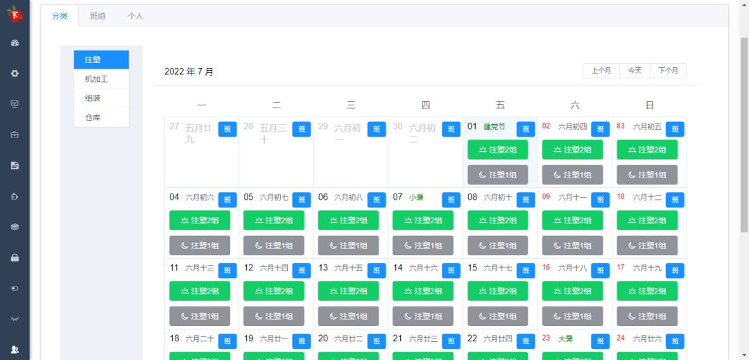 | 排班管理 | 班组、班次设置,排班计划制定,节假日/工作日管理 |