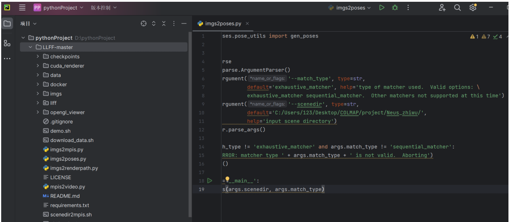 并用本地的Pycharm创建一个项目,在新建的项目里面打开LLFF-master