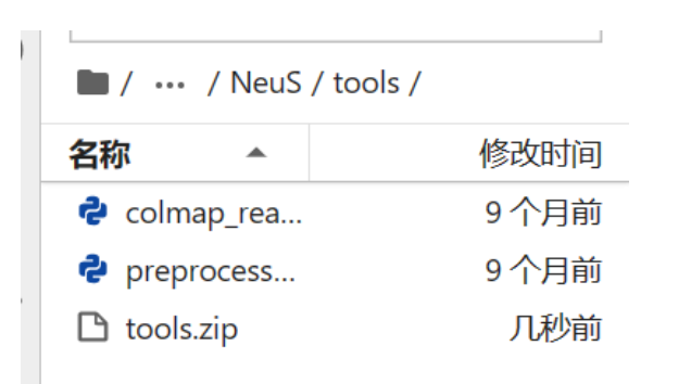 这个网址提供了LLFF数据格式转DTU数据格式的代码。 将代码解压到autodl-tmp/NueS/tools目录下。如下