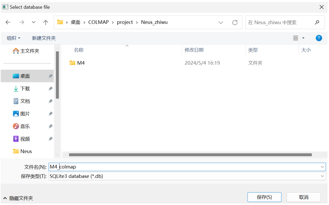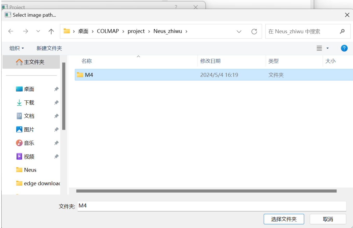 点击New,选择一个文件夹(与测试的植物图片M4放置在同一目录),设置工程名M4_colmap以新建工程数据文件。