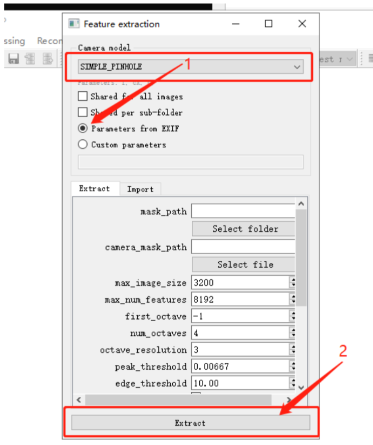 点击Processing -> Feature extraction,Camera model选择SIMPLE_PINHOLE,其他配置使用默认配置即可,点击Extract后,自动开始提取图片特征。