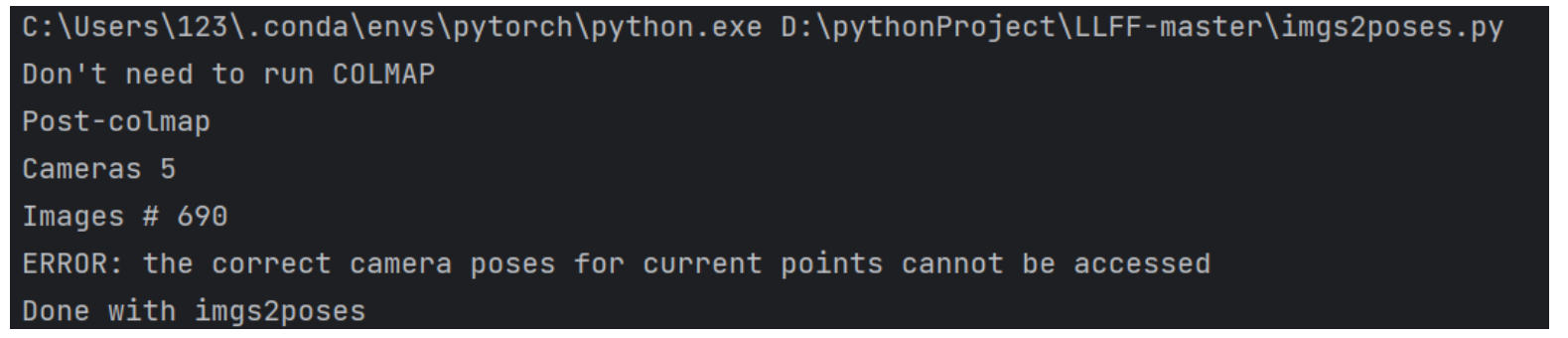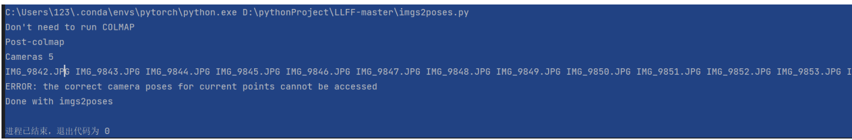 在重新又做完colmap的一系列步骤之后,又重新运行imgs2poses.py文件,成功运行后会得到如下的提示信息
