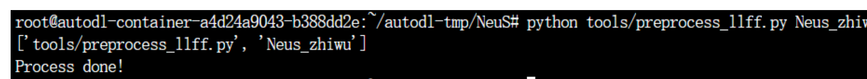 然后又运行如下命令(注意在autodl-tmp/Neus目录下),对colmap处理的结果进行预处理,从而得到满足格式要求的数据集(数据集里面就包含三个东西:①image;②npz;③mask)