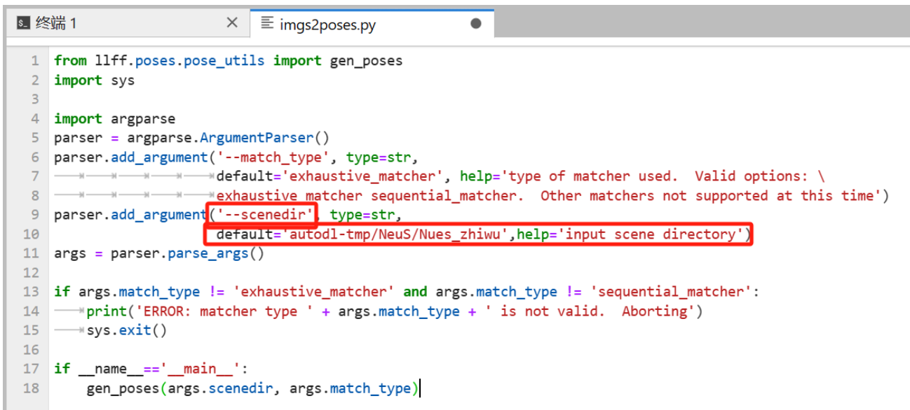 进入LLFF目录下,打开imgs2poses.py文件,新增如下内容,default=‘里面是sparse所在目录的绝对路径’,并将参数’scenedir’修改为是’- -scenedir’。