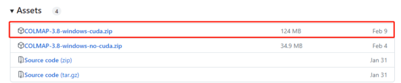 下载COLMAP软件【下载地址】,本文使用的是Windows下的CUDA版本:
