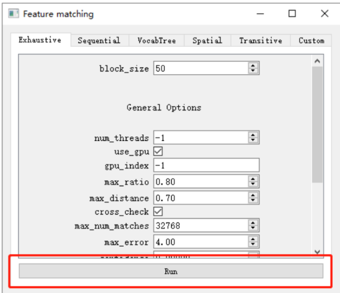 点击Processing -> Feature matching,使用默认配置直接点击Run进行特征匹配。
