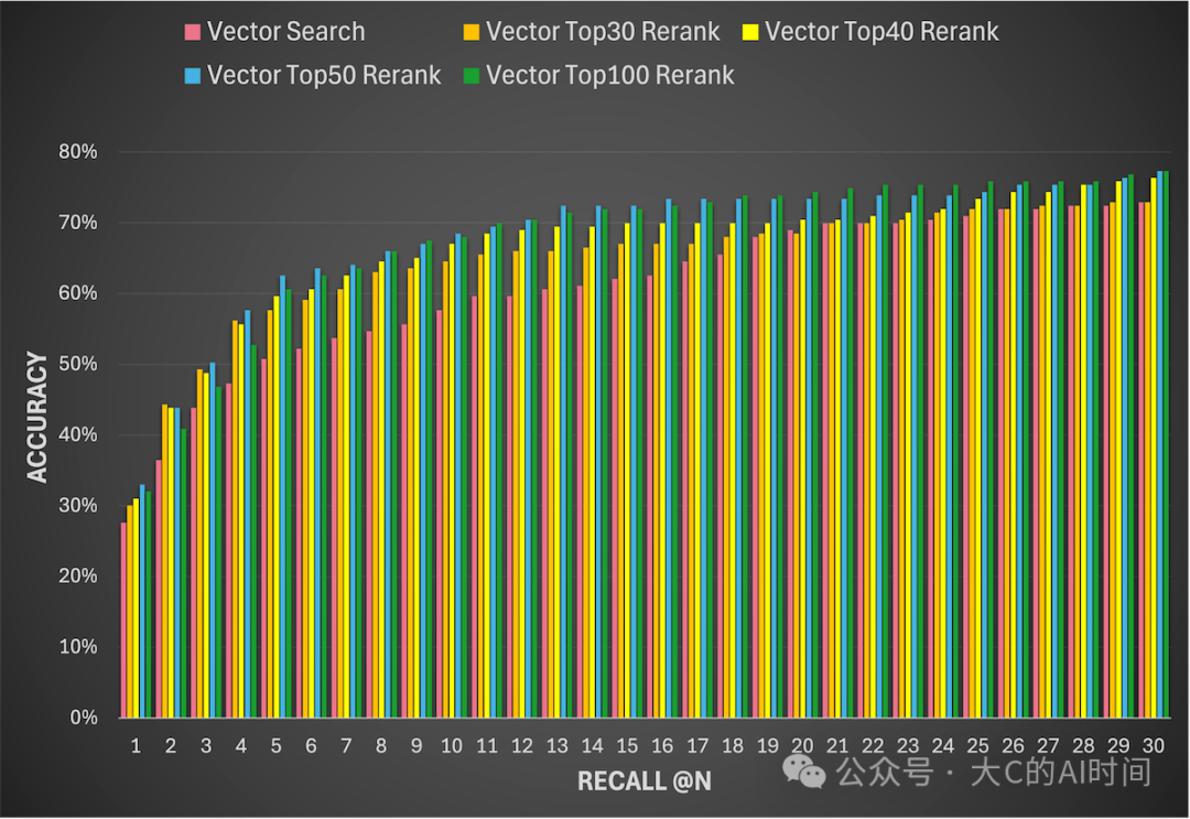 - **Rerank:**准确率高,但耗时较大,适合作为精排阶段,对粗排结果进一步提升正确文档的排名。实验表明,对于相同的 N 值,Rerank 比 Vector Search 的准确率普遍提升约 10%