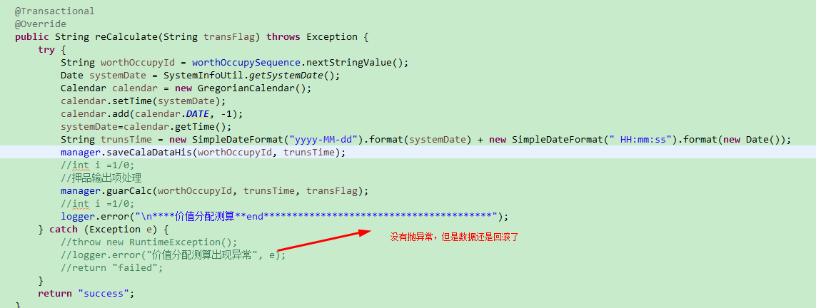 五、发现在加@Transactional 注解下,捕获了异常不抛出,事务也回滚了