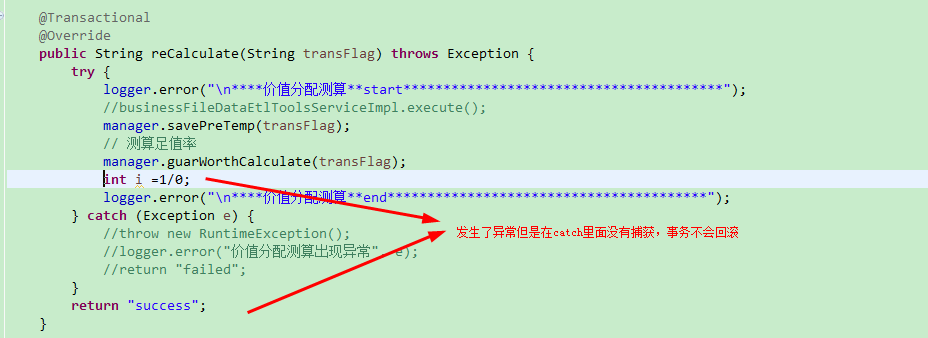 一、在调用方法上虽然写了@Transactional,但捕获了异常却没有抛出