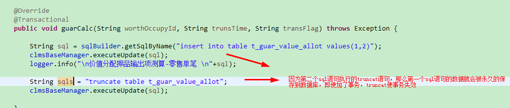 二、在sql语句用写了TRUNCATE TABLE 表(在TRUNCATE之前的sql执行完后就回被更新到数据库中,事务也就不会回滚)。