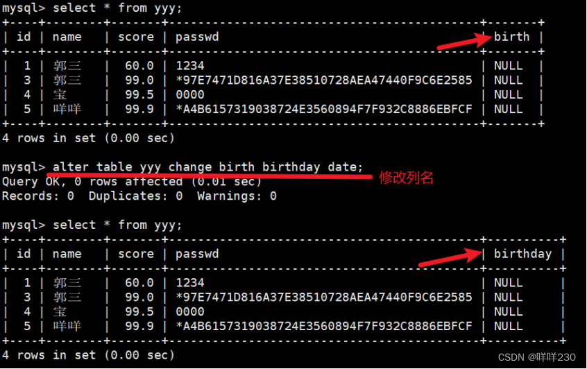 ⑯修改列名alter table yyy change birth birthday date;