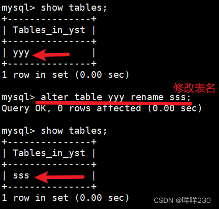 修改表名alter table yyy rename sss; |