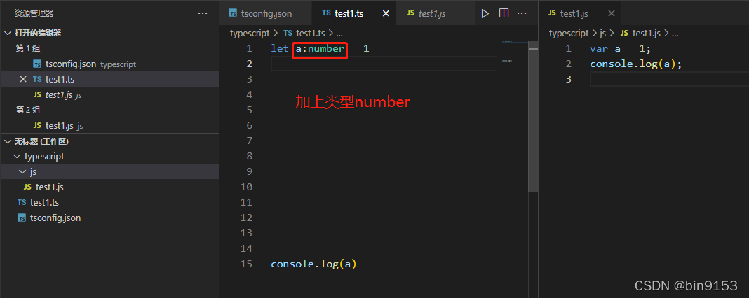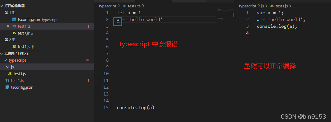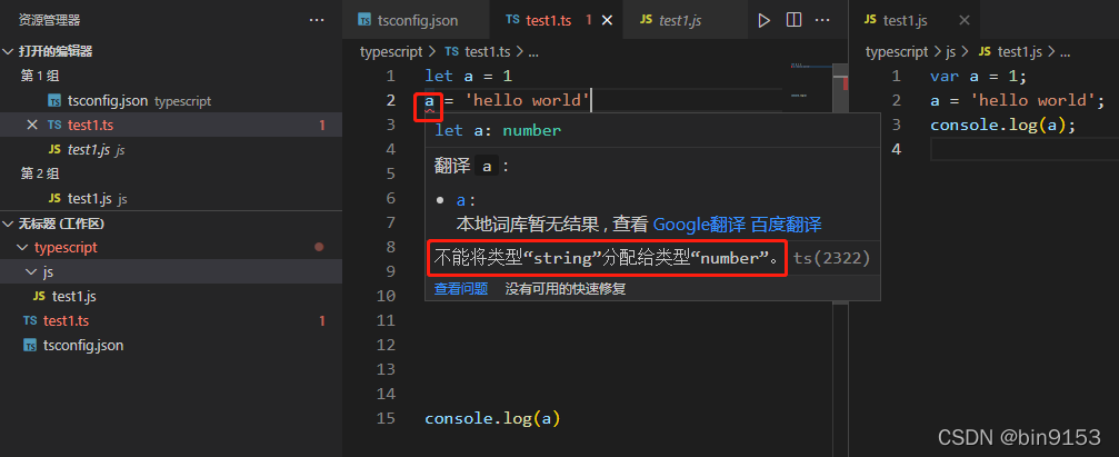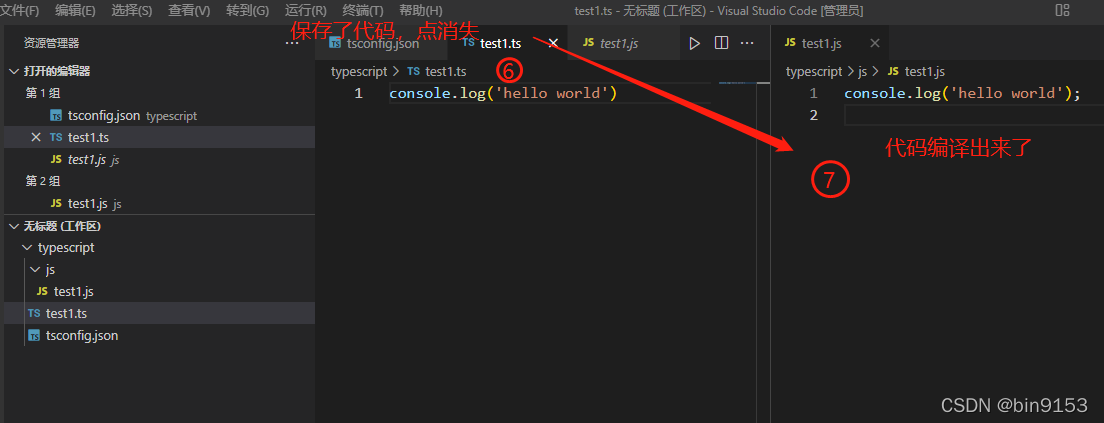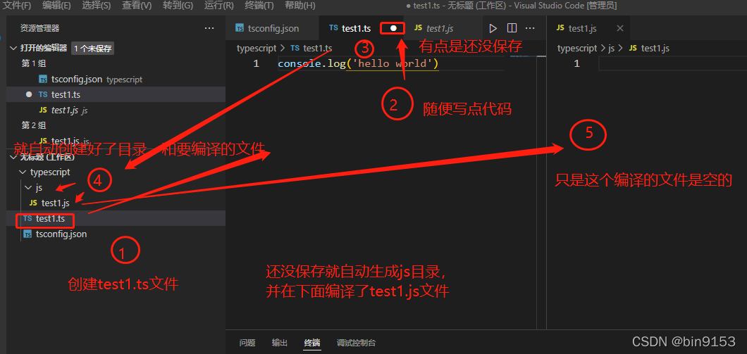 如果不使用自动编译,每次写好代码时需要运行 tsc test1.ts 或者 tsc demo.ts 或者 tsc main.ts ...
