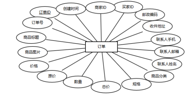 订单实体包括订单ID、订单号、商品ID、商品标题、商品图片、价格、原价、数量、总价、规格、商品分类、联系人姓名、联系人邮箱、联系人手机、收件地址、邮政编码、买家ID、商家ID、创建时间、更新时间、产品规格描述、订单状态、订单备注、发货状态、折扣、购买类型等。订单实体如图4-8所示。