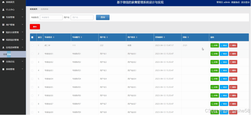 管理员点击在线咨询管理,在在线咨询管理页面对专家姓名、专家账号、用户名、用户姓名、咨询时间、回复等信息,进行查询或删除在线咨询等操作;如图5-6所示。