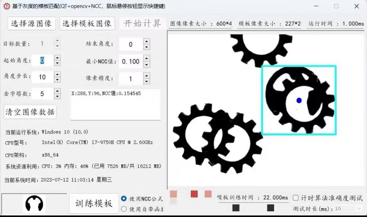 Qt Opencv c++模板匹配 灰度信息ncc模板匹配算法 可跨平台 模板匹配 opencv 开发工具为Qt Opencv c++ 基于灰度信息ncc的模板匹配算法 匹配时间在10ms内性能强大如图可以1ms出结果 可以跨平台运行,做了windows和ubuntu适配 纯个人开发,手敲 代码附带各种功能,稳定性极强 ,全新基本原理,可用作学习