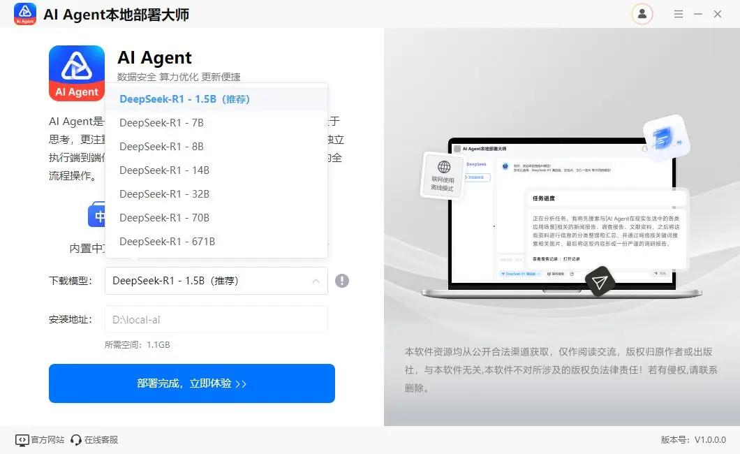 它支持一键部署AI模型,无论是初学者还是资深用户,都能在短时间内轻松搭建本地AI Agent部署环境。软件界面简洁,操作易懂,即使是小白也能快速在电脑本地部署配置AI智能体,实现更多创意操作。