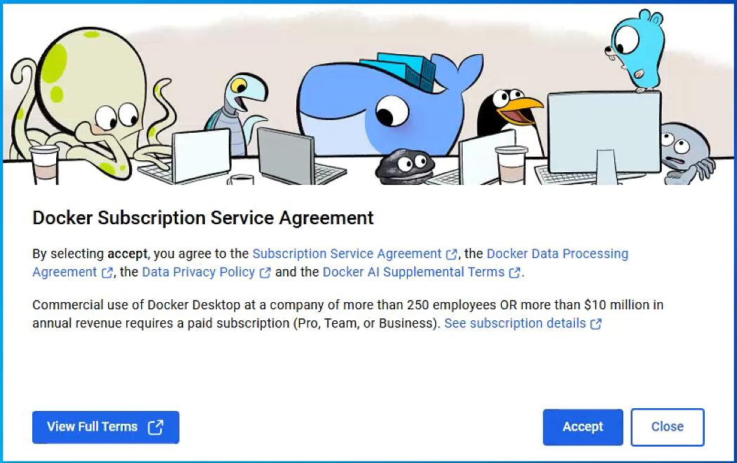 这个弹出的 Docker Subscription Service Agreement(Docker 订阅服务协议)不是一个“技术配置”,而是 Docker 官方的 使用许可与订阅条款,作用主要是告诉你——在安装或继续使用 Docker Desktop 前,你需要同意它的最新授权规则和使用条件。