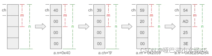 因此当赋值a.ch = '9'后,打印结果为:n = 0X39, ch = 9, m = 0X39。
