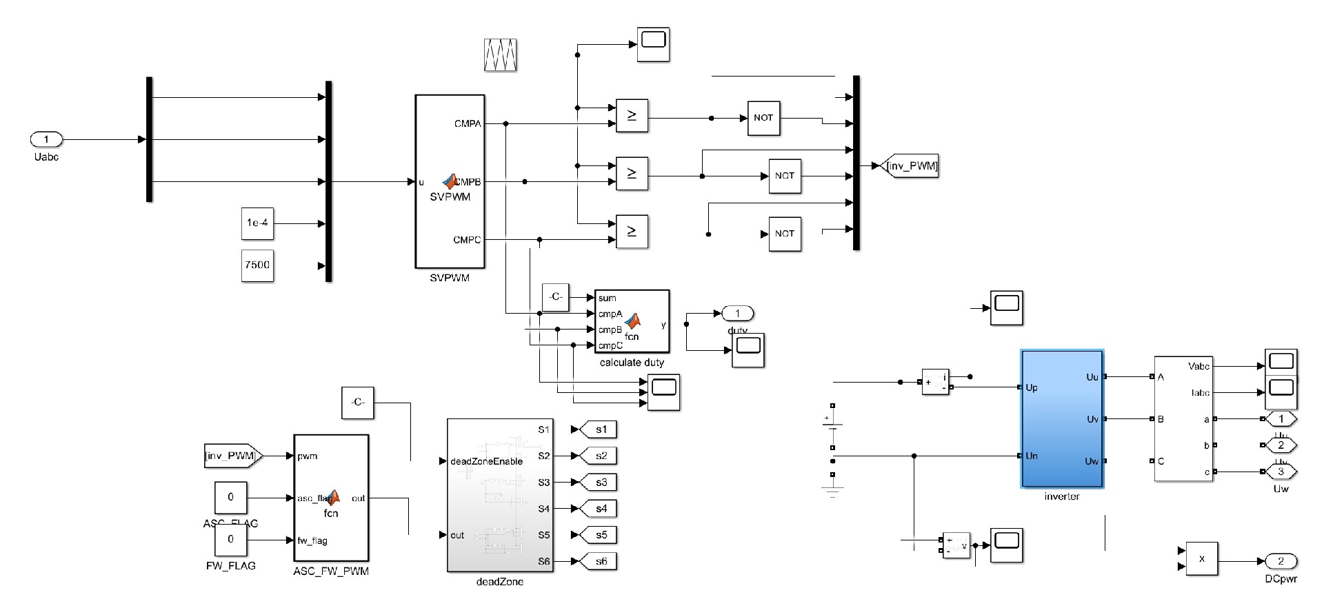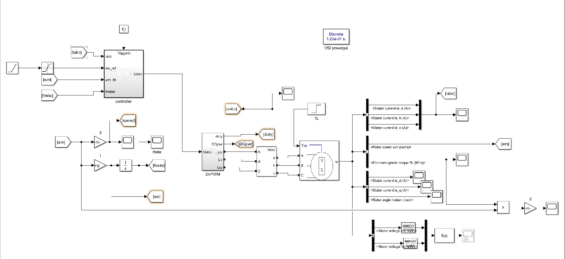 先看整体框架——这系统是FOC控制套着温度估算的紧箍咒。咱们在SVPWM调制环节后面插了个损耗计算模块,直接把开关过程的电流电压波形喂给热模型。注意看这个黑科技操作:用Simscape Electrical里的IGBT模块自带损耗输出端口,不用自己写方程真香!