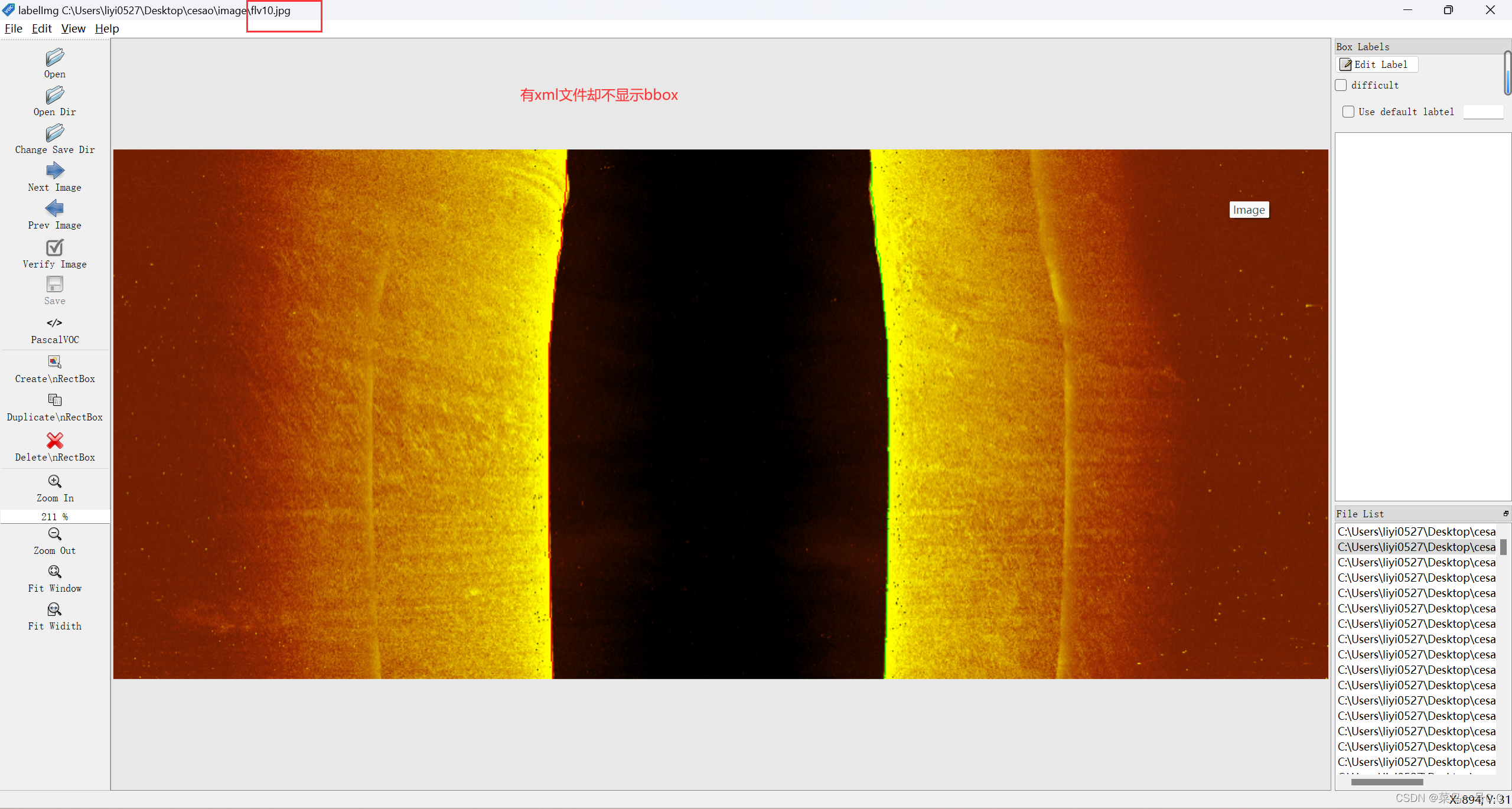 Open Dir和Change Save Dir都设置的没问题,发现图片有标注好的xml文件却在labelImg中无法显示bbox,如图所示: