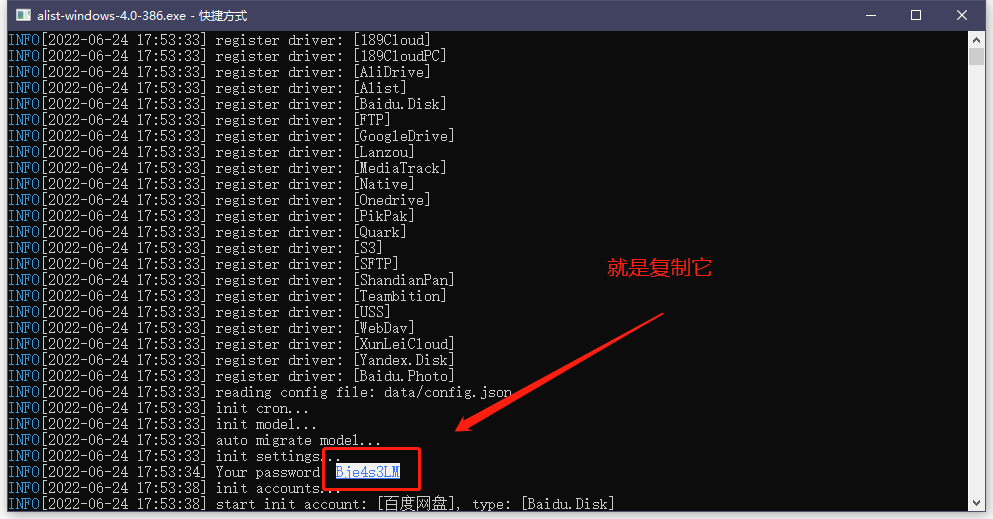 2.右击alist,「以管理员身份运行」alist.exe,在弹出的命令行窗口中复制高亮的初始管理密码。