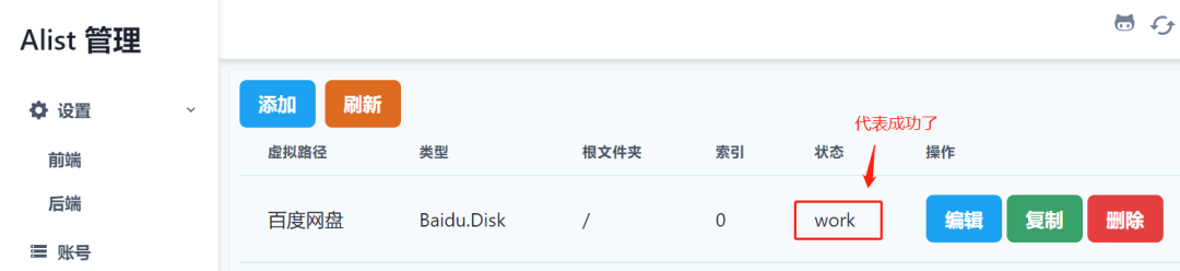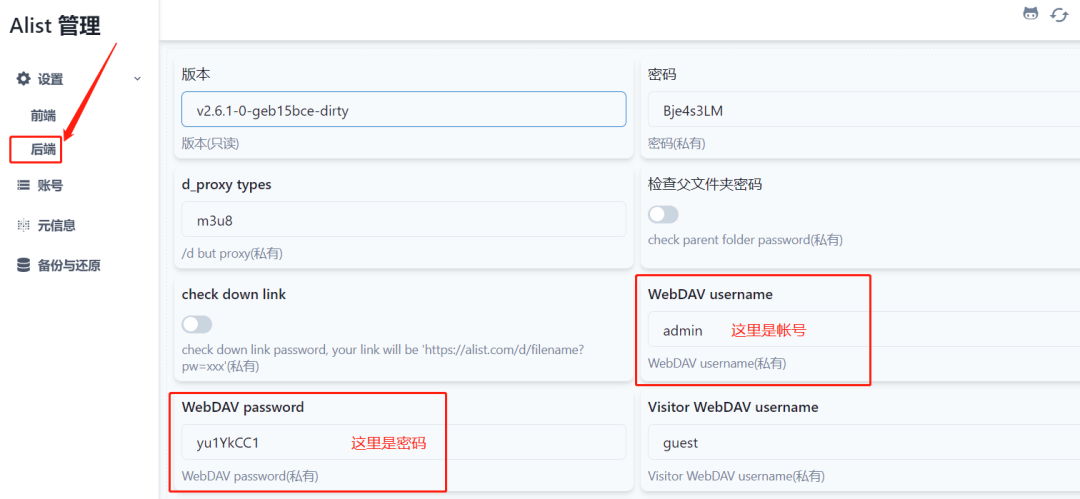 5.密码是随机的,每个人不同,获取方式在 Alist管理后台-后端中,步骤如下。