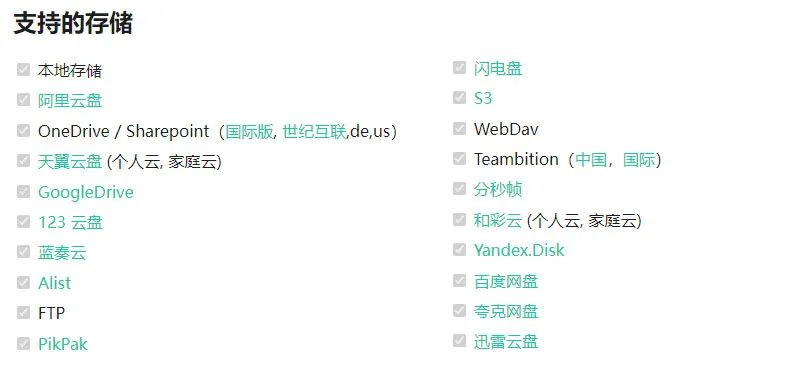 这是一款支持多种存储的目录文件列表程序,已开源,支持的储存类型如下,国内大部分的网盘应该是都包括了。
