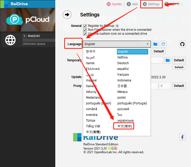 2.安装完成直接运行RaiDrive,点击Settings-Language,选择简体中文。