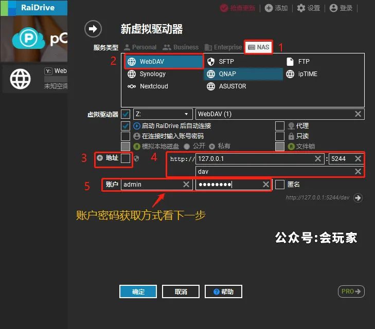 4,填写虚拟驱动器配置,直接按照下图的步骤和填写内容填写即可,账号密码看下一步。