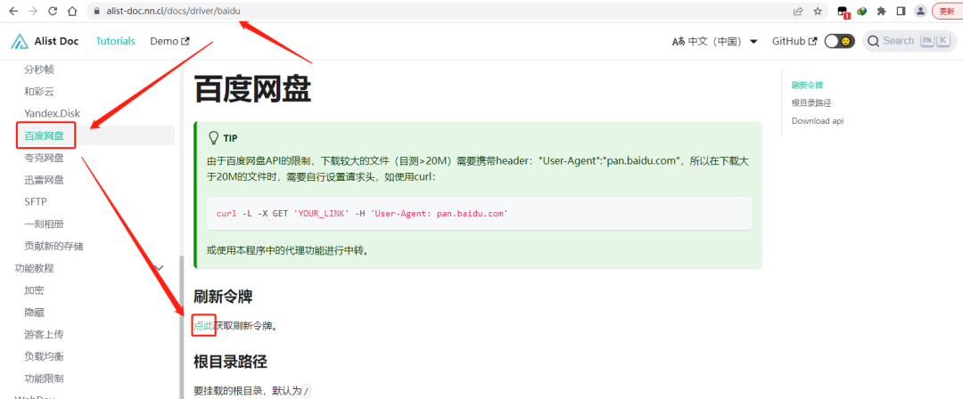 8.关于各种网盘的绑定方法,Alist的开发者都已经做了详细文档(每种网盘的设置方法都不太一样)。