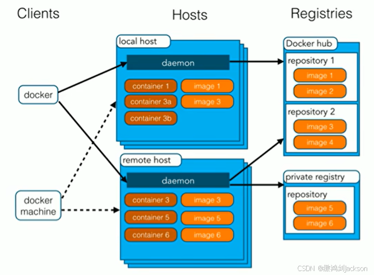 image 3)可以被多个容器使用,甚至跨不同主机。容器运行在 Docker 守护进程之上,由守护进程负责容器的生命周期管理。