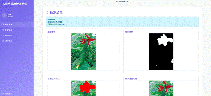 提供用户上传图片的界面(支持拖放或文件选择)、展示篡改检测结果(可视化标记篡改区域)、使用 Chart.js 可视化检测置信度和分析数据、与后端 API 交互(发送图片、接收检测结果)、响应式设计适配不同设备屏幕 |