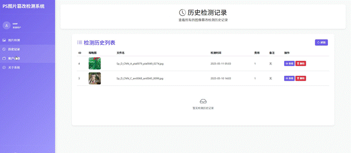 存储用户上传的图片元数据(文件名、时间戳)、保存检测结果(篡改位置、置信度、处理时间)、记录用户操作日志和系统统计信息 |