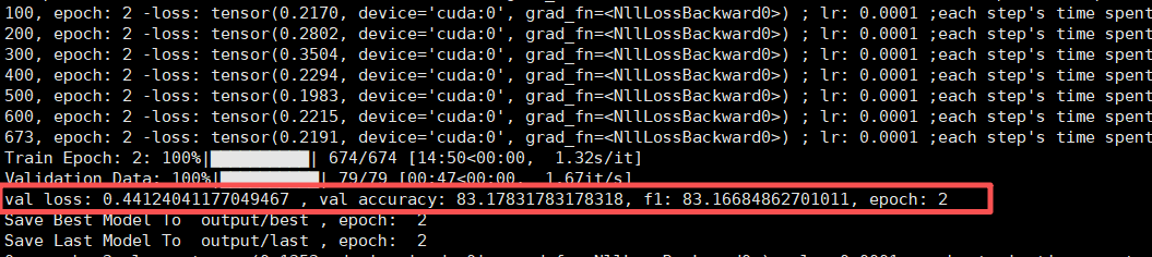 训练结束,在 dev 验证集上最好的表现 loss 为 0.4412,准确率为 83.17 ,F1:83.16 :