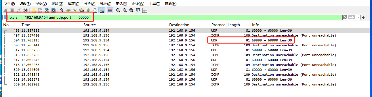 udp.port == 53 - 显示 UDP 源或目标端口是 53 的包。