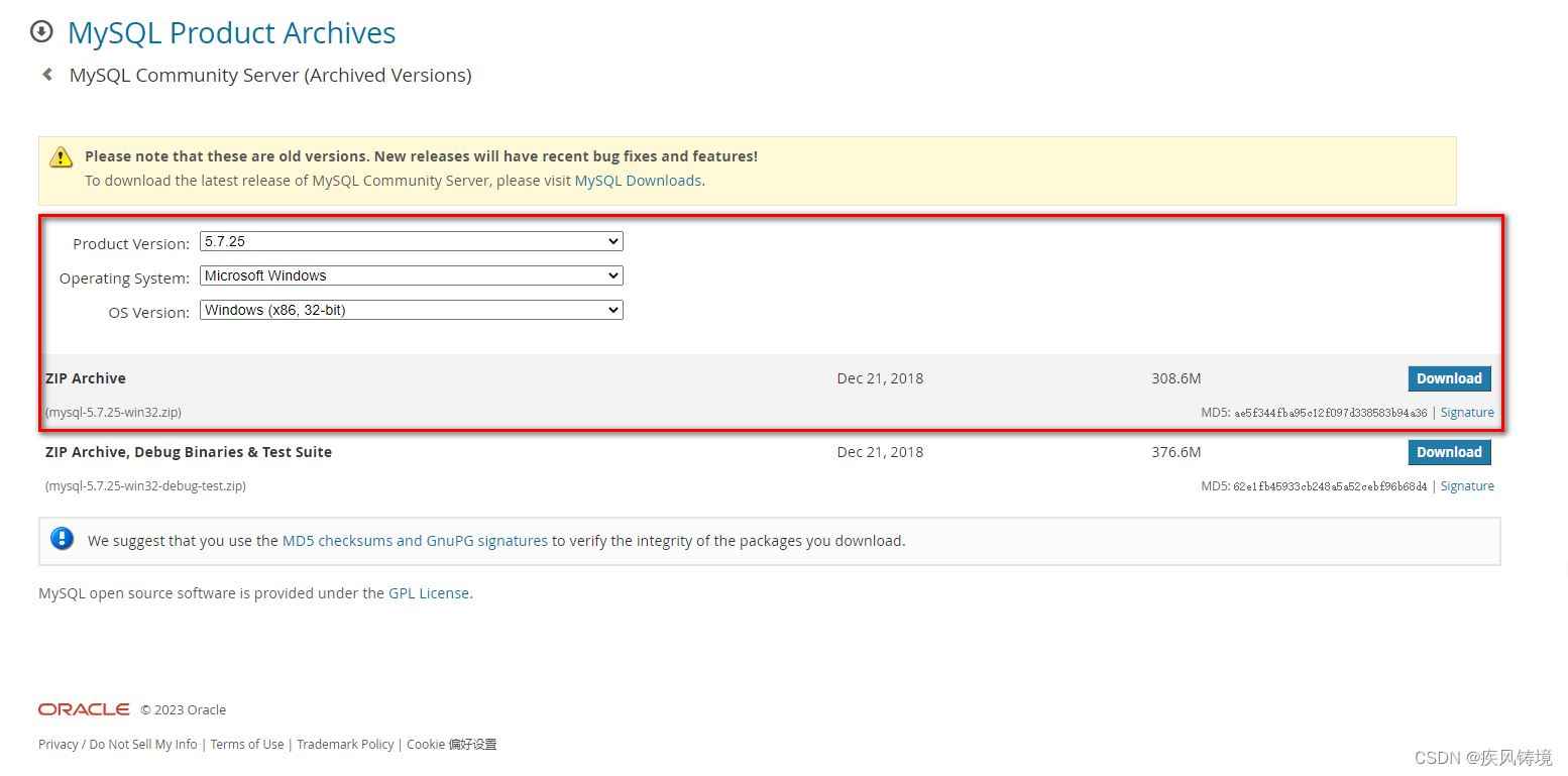也可以打开MySQL :: Download MySQL Community Server (Archived Versions)网页后,自行选择32位版本的mysql软件进行下载,网络上常见的mysql-installer-community-5.7.25.0.msi安装时候有时候会可以选择X86的安装,默认是64位的安装,如果安装目录是C:\Program Files\MySQL\MySQL Server 5.7则证明安装的版本是64位的,如果安装位置为C:\Program Files (x86)\MySQL\MySQL Server 5.7则证明安装的是32位的。使用64位mysql编译出来的驱动无法在mingw32中使用。
