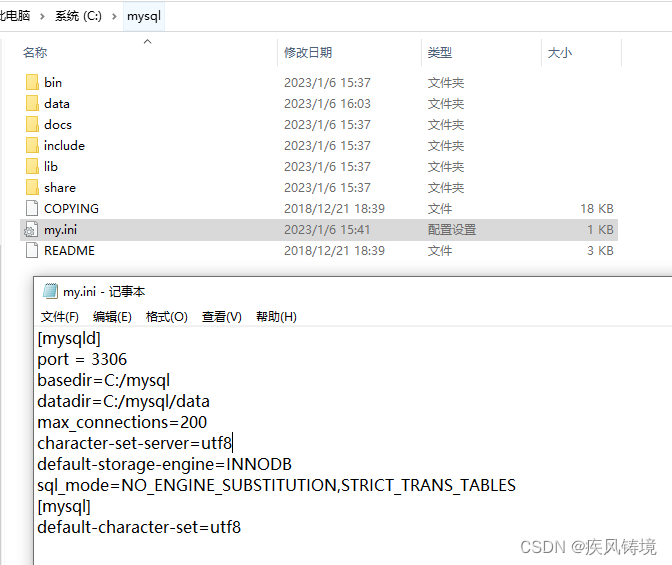 3、打开C:\mysql目录,新建一个my.ini文件,使用记事本打开后编辑文件内容为: