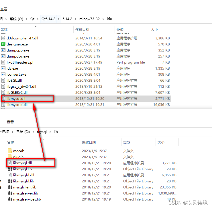 源目录:C:\mysql\lib到目标目录:C:\Qt\Qt5.14.2\5.14.2\mingw73_32\bin下