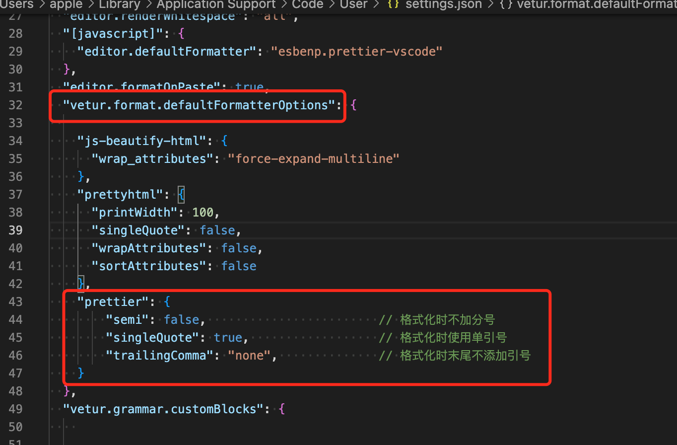 "vetur.format.defaultFormatterOptions": { "prettier": { "semi": false, // 格式化时不加分号 "singleQuote": true, // 格式化时使用单引号 "trailingComma": "none", // 格式化时末尾不添加引号 } },