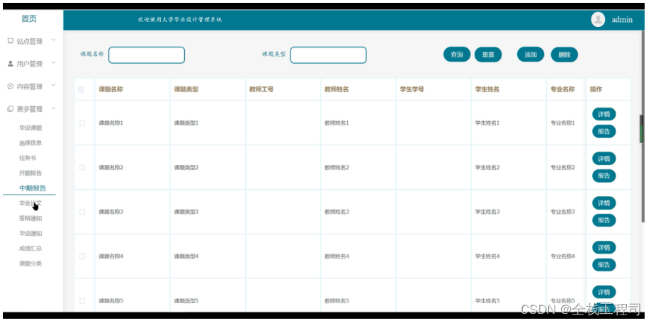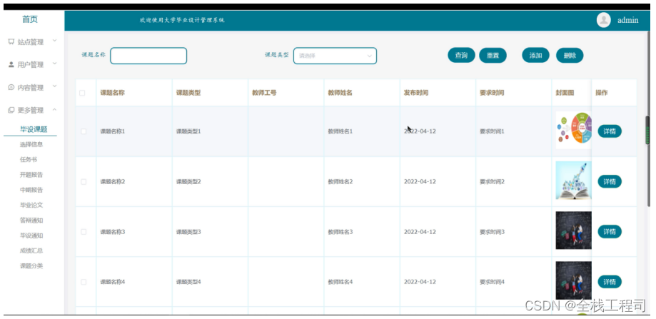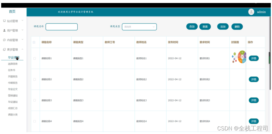 毕设课题:通过列表可以获取课题名称、课题类型、教师工号、教师姓名等信息,进行删除或修改操作,如图5-7所示。