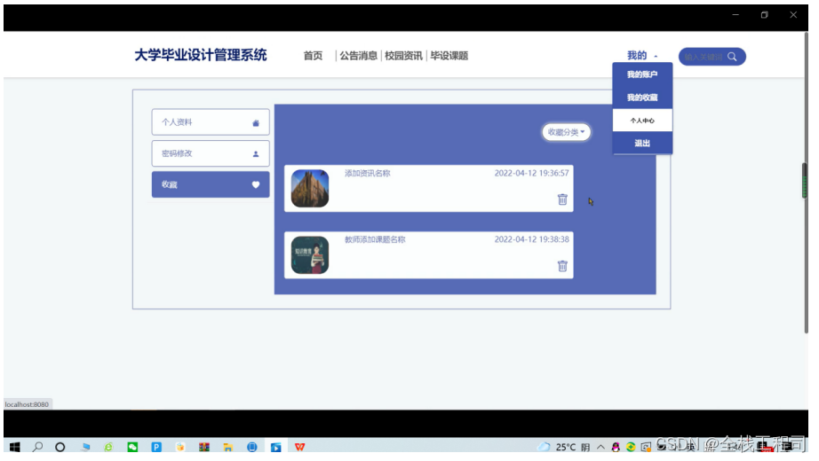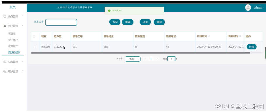 使用大学毕业设计管理系统的分为管理员和用户、两个权限模块。
