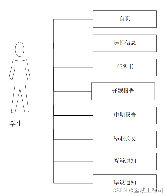 学生注册登录后可进行首页、选择信息、任务书、开题报告、中期报告、毕业论文、答辩通知、毕设通知管理,学生用例如图3-2所示。