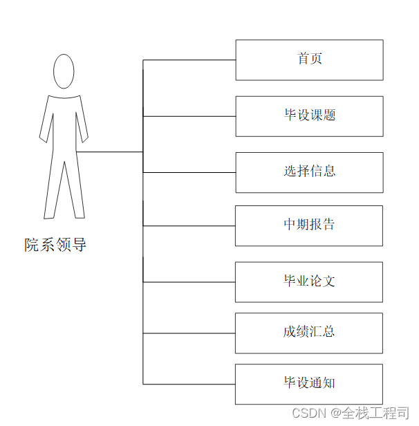 院系领导注册登录后可进行首页、毕设课题、开题报告、中期报告、毕业论文、答辩通知、毕设通知、成绩汇总管理,院系领导用例如图3-4所示。