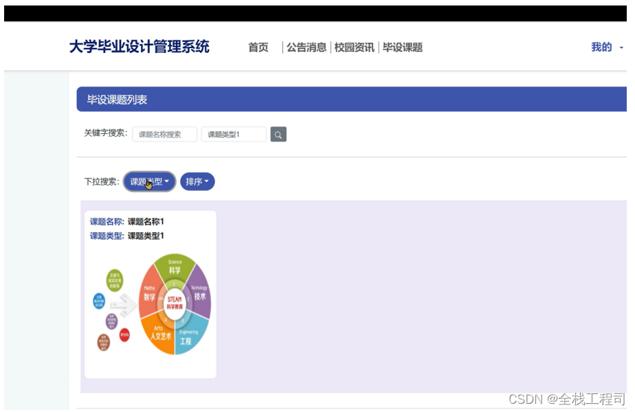 毕设课题列表管理:毕设课题列表页面可查看课题名称、课题类型、图片等信息如图5-3所示。