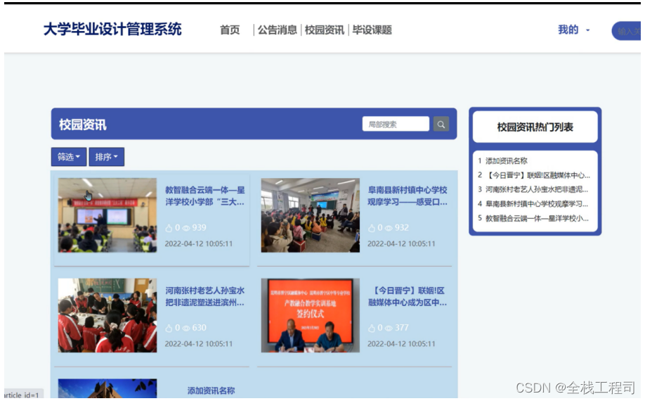 模块包括主界面,首页、公告消息、校园资讯、毕设课题等进行相应的操作。