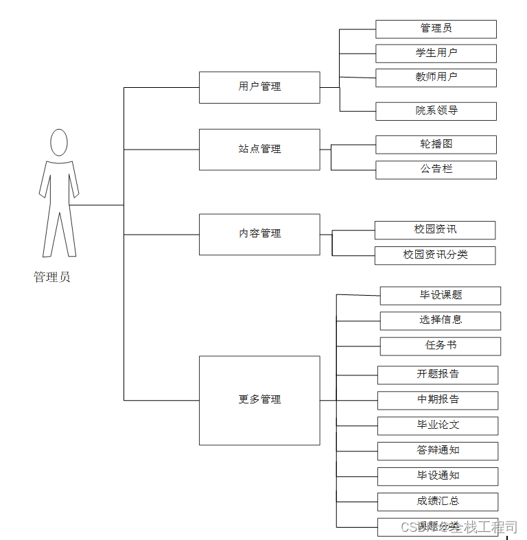 管理员登录后可进行首页、首页、站点管理(轮播图、公告栏)用户管理(管理员、学生用户、教师用户、院系领导)内容管理(校园资讯、校园资讯分类)更多管理(毕设课题、选择信息、任务书、开题报告、中期报告、毕业论文、答辩通知、毕设通知、成绩汇总、课题分类),管理员的用例如图3-1所示。