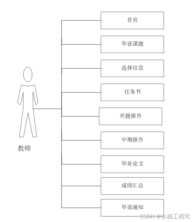 教师注册登录后可进行首页、毕设课题、选择信息、任务书、开题报告、中期报告、毕业论文、毕设通知、成绩汇总管理,教师用例如图3-3所示。